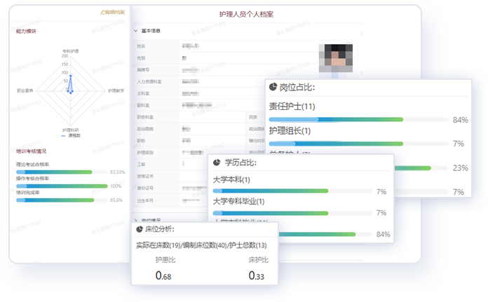 实现组织架构动态管理、岗位权限管理赋能人事决策;护理人员全面档案管理,覆盖人员全职业周期