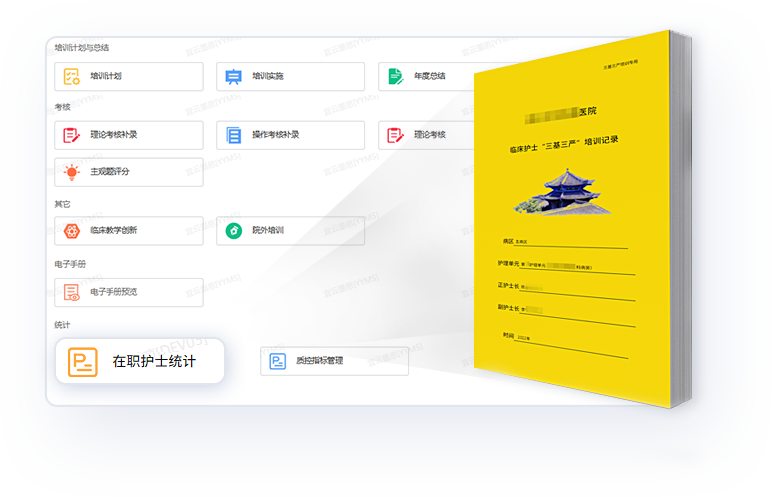 通过信息化培训、考试/考核、考核小结、年终总结等培训管理功能,生成科室三基三严培训电子手册,助力医院等级评审
