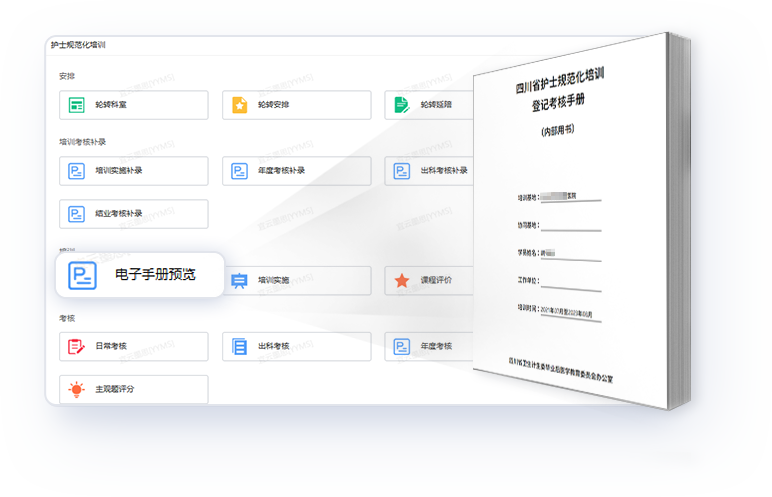 根据四川省护士规范化培训要求,建立线上规培系统,覆盖规培周期全过程,对照《四川省护士规范化培训登记考核手册》,生成《四川省护士规范化培训登记考核手册-电子版》,数据均来源与规培系统,从而保证数据的真实性和权威性。